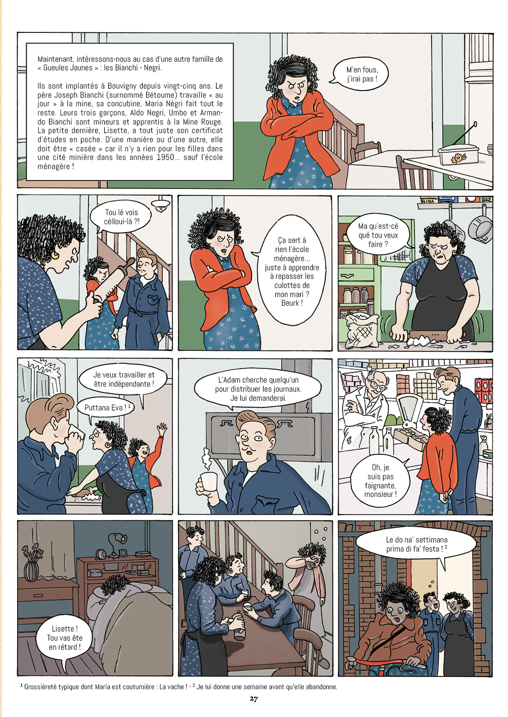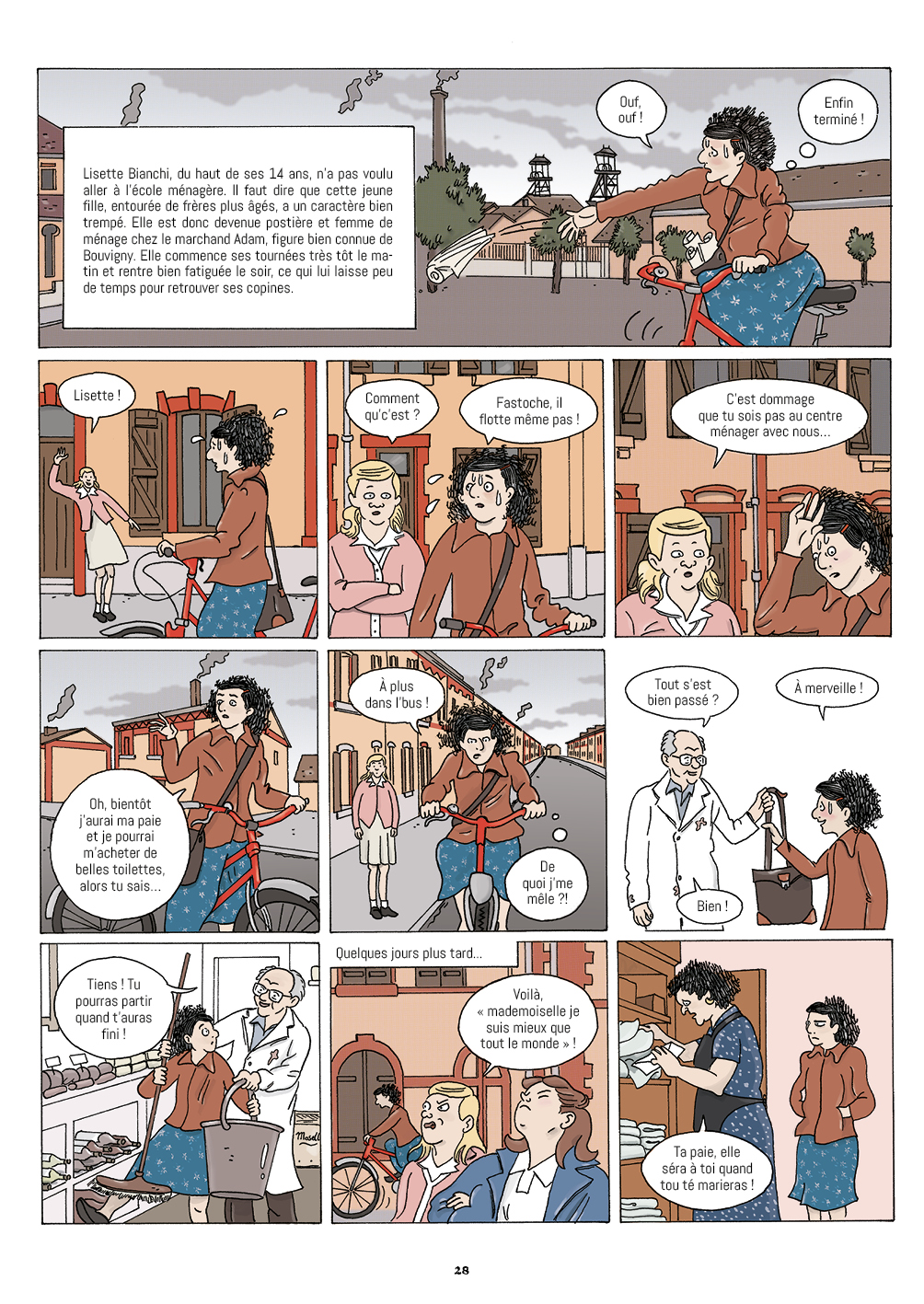 Dans les cités Rouges Lisette Bianchi 14 ans, fille d’immigrés italiens, rêve de liberté. Non, elle ne fera pas l’école ménagère pour apprendre à repasser les culottes de son mari. Elle préfère travailler : livrer des journaux et faire le ménage. Mais dans les Cités minières on reste à sa place, on n’apprécie pas celui ou celle qui fait différemment. C’est en gros le message transmis à nos deux protagonistes en ce début des Trente Glorieuses.